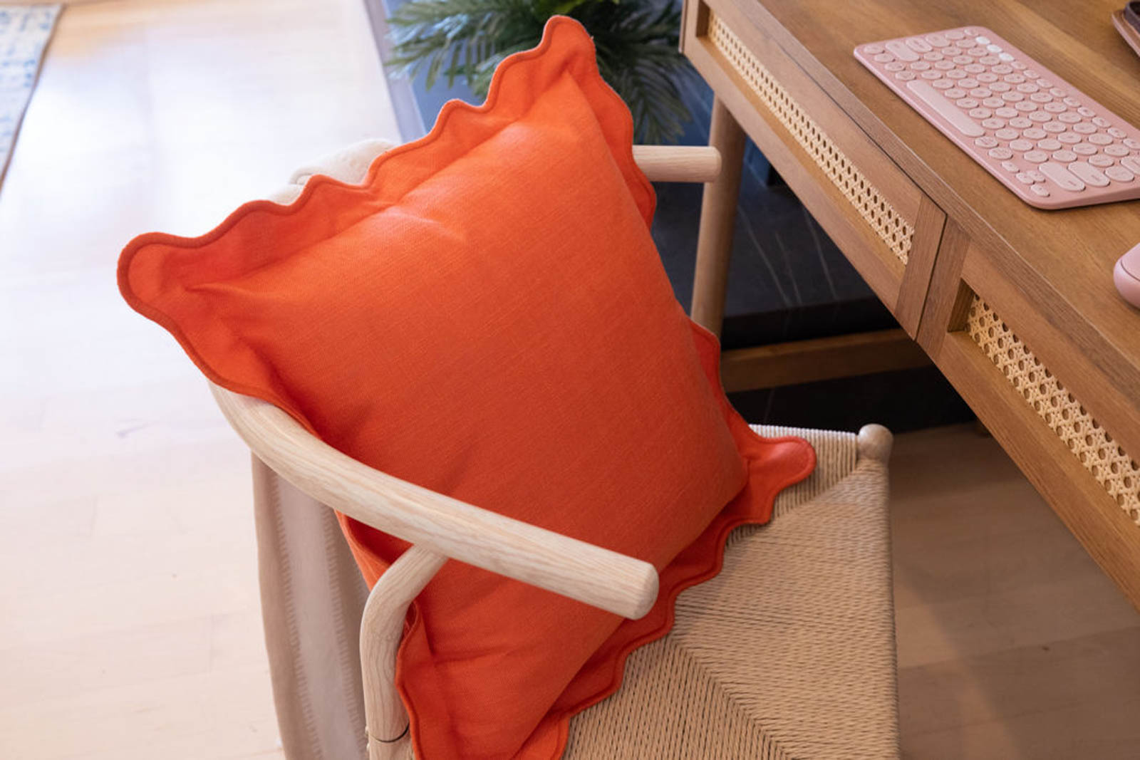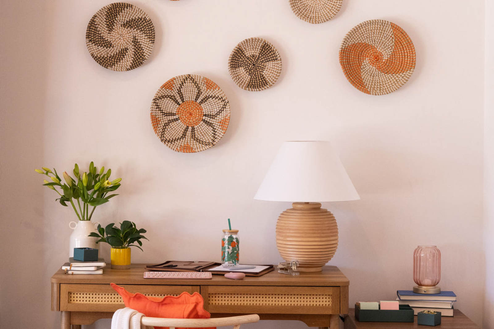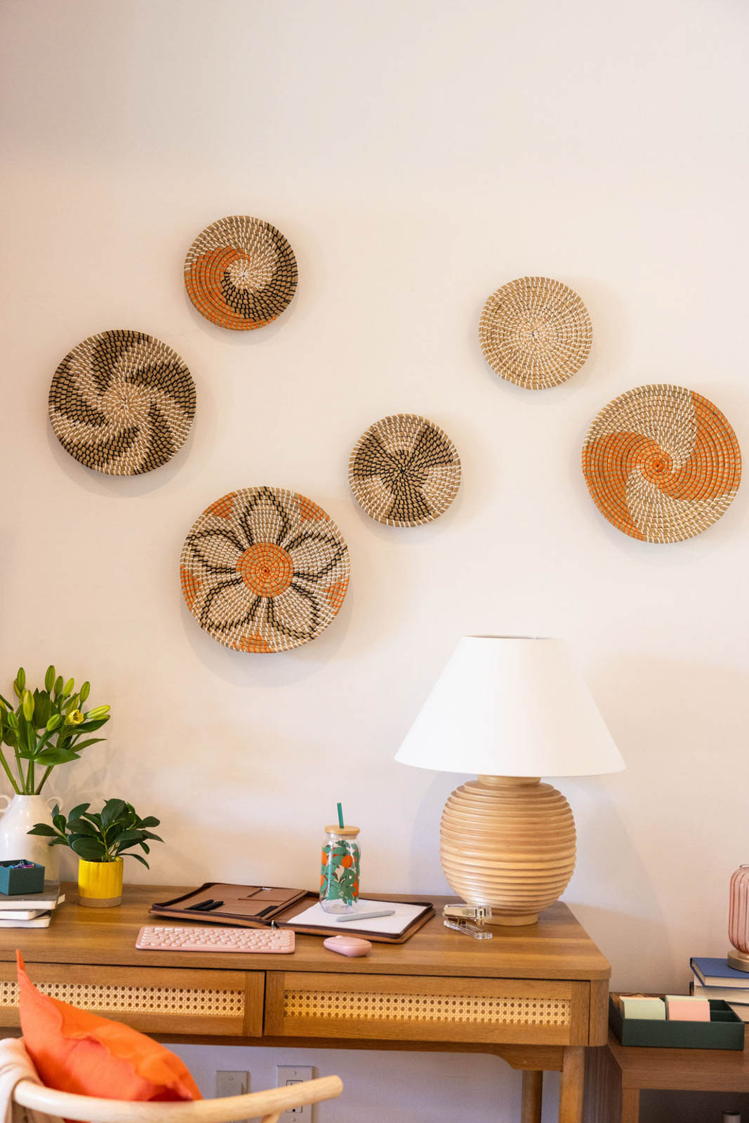 The home office setup felt productive and warm. Colorful decor softened the space, while practical pieces kept it functional. Meanwhile, personal touches made it feel like a place where real work happens. Layers of texture and thoughtful accessories pulled everything together.